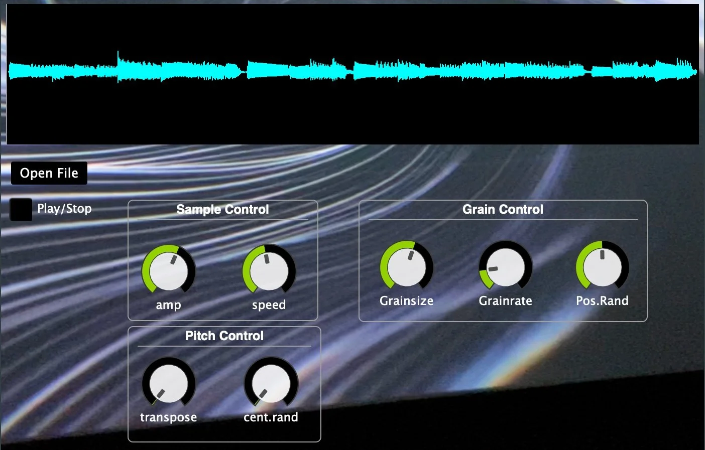 The sample control module controls the amplitude and the playback speed of the original sample. The grain control module controls the grain size, grain rate, and playback position randomness. The pitch control module transposes the sample, and the cent.rand nob gives random transposition by cents.
